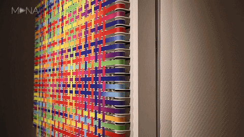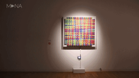 熵是用以描述系統(tǒng)狀態(tài)的函數(shù),也用來描述系統(tǒng)的混亂程度。作品基于系統(tǒng)與變量之間映射的關(guān)系,將觀眾作為改變靜態(tài)穩(wěn)定系統(tǒng)的因素:當(dāng)觀眾走過,觸發(fā)感應(yīng),從而回饋馬達的轉(zhuǎn)動,以帶動彩色經(jīng)緯的變化,從而最終改變畫面。每一次的介入會帶來隨機的結(jié)果,通過不斷的觸發(fā)、計算、累積、疊加,以生成無盡的畫面,來解析有限與無窮、失序與重構(gòu)、進化與迭代、感知與虛無的多重可能。
