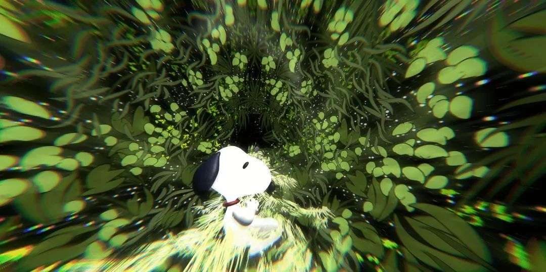 作品讓觀眾隨著史努比動漫形象在虛實之間尋找童年回憶中遺失的美好。運用VR虛擬現(xiàn)實光繪、3D掃描等技術(shù),用視聽語言創(chuàng)造出瑰麗的光影世界。