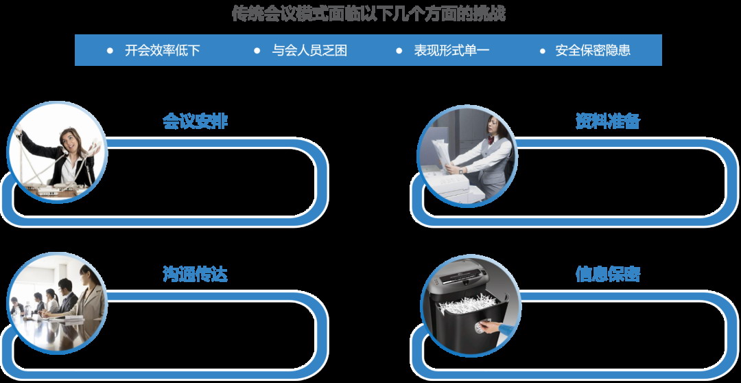 每次開會,工作量大且缺乏應變能力,會場排位手工管理、機動性差、效率低。與會人員交互時需要操作多套設備(音頻、視頻、文件操作等),增加系統(tǒng)使用難度。與會人員桌面布局復雜,物品繁多凌亂。會議中資料修改情況難以記錄,討論過程無法保存。與會人員與服務人員間溝通不暢。會后文件管理造成巨大的紙張浪費,紙質(zhì)材料可能導致泄密,安全無法保障,對高端機密會議造成嚴重威脅,可能導致重大損失。