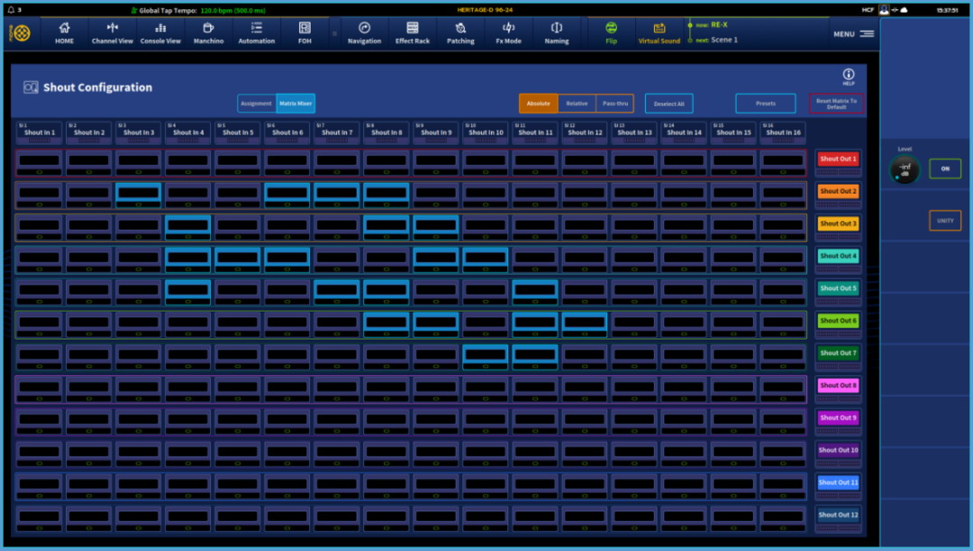 03 另外,它的Shout內(nèi)通模式配置可實現(xiàn)16×12的矩陣混音,該功能可用于舞臺工作人員的內(nèi)部通訊,亦或者舞臺監(jiān)聽系統(tǒng),并不會占用常規(guī)的處理通道。這樣能做到任意混合發(fā)送、路由配置信號、存儲/調(diào)用預(yù)設(shè)快速部署等等,從而簡化現(xiàn)場和轉(zhuǎn)播音頻工程師的工作。