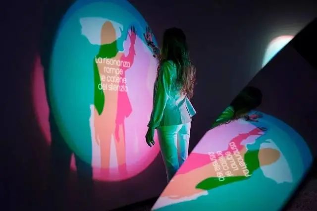 大圓鏡面將體驗(yàn)者的彩色光影反射到墻面上。當(dāng)體驗(yàn)者將自己置于光錐中時(shí),便會(huì)在墻面上找到共鳴的引語(yǔ)。
