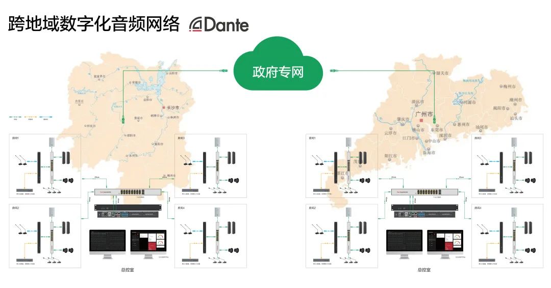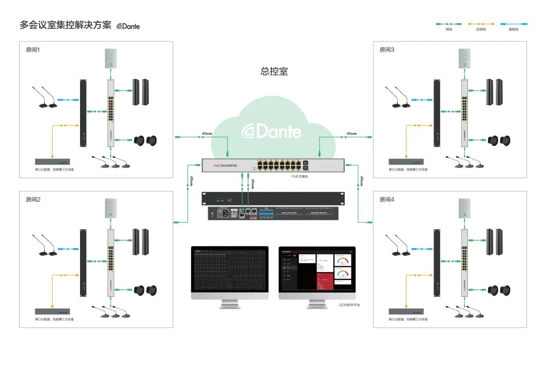 基于用戶需求變化的驅動與Dante技術在音頻領域的深度應用,同創(chuàng)音頻推出了以本地音頻處理地節(jié)點,Dante網絡為樞紐,中心服務器統(tǒng)一管理調控的Dante網絡化音頻解決方案來應對人們對于高效會議室環(huán)境的要求。