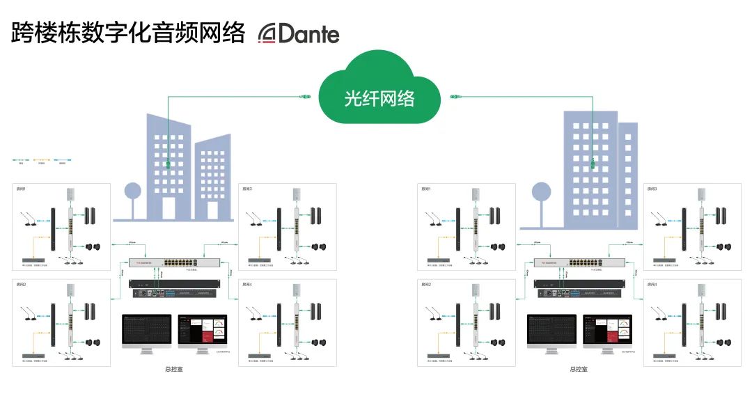 當會議室不在同一樓棟時,也可以通過光纖連接并打通不同樓棟間的Dante網絡,以實現互聯互通(如大型企業(yè)產業(yè)園、核心企業(yè)伙伴等)。