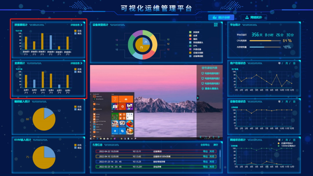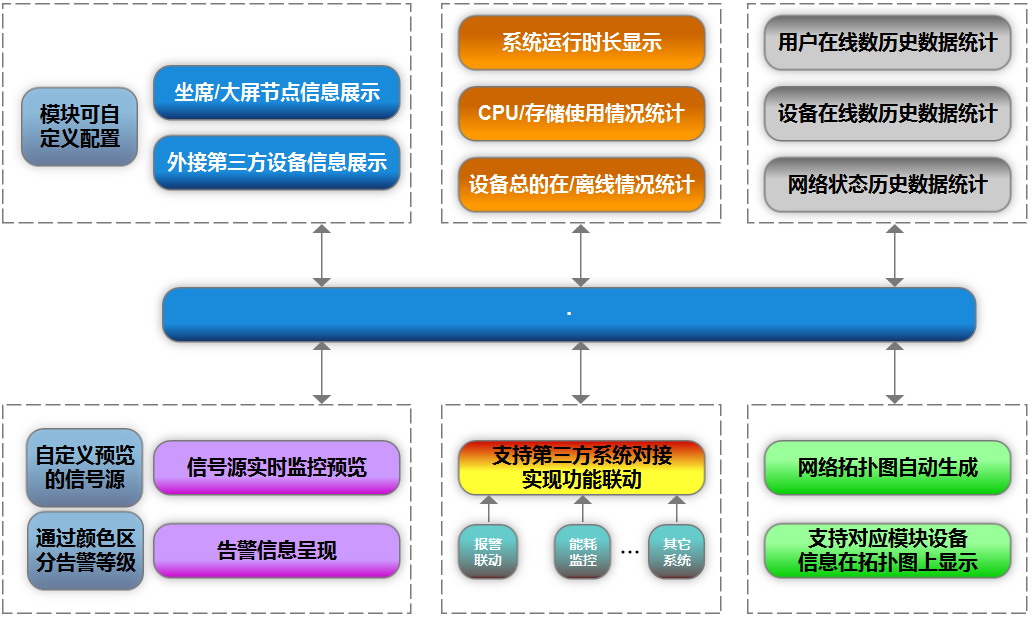 可視化運維管理平臺集拼接屏/坐席統(tǒng)計、編碼輸入統(tǒng)計、KVM輸入統(tǒng)計、UT統(tǒng)計、DPS統(tǒng)計、平臺統(tǒng)計、用戶在線狀態(tài)、設(shè)備在線狀態(tài)、網(wǎng)絡(luò)狀態(tài)統(tǒng)計、設(shè)備類型統(tǒng)計、反監(jiān)預覽功能、告警信息欄、自動生成網(wǎng)絡(luò)拓撲圖等功能于一體,可以直觀的展現(xiàn)系統(tǒng)中對應(yīng)設(shè)備的相關(guān)信息。