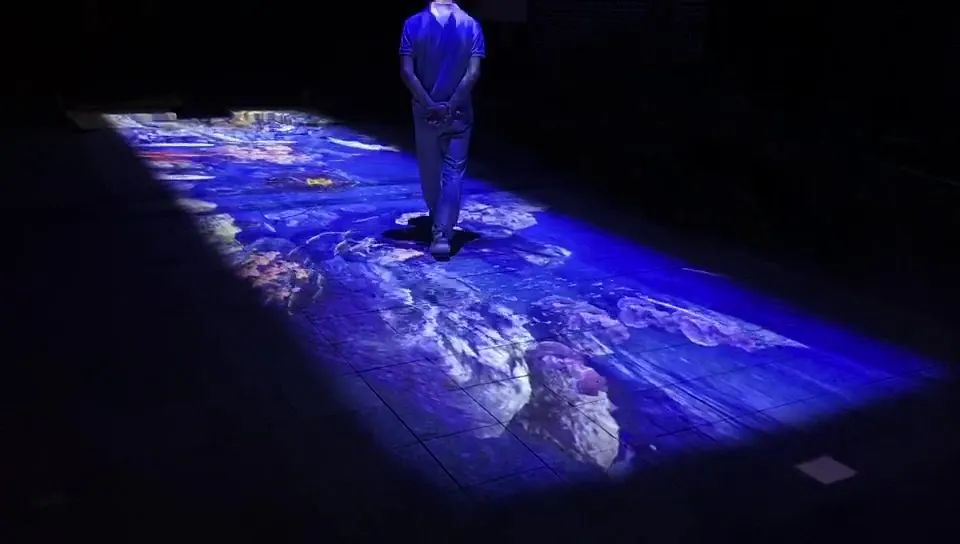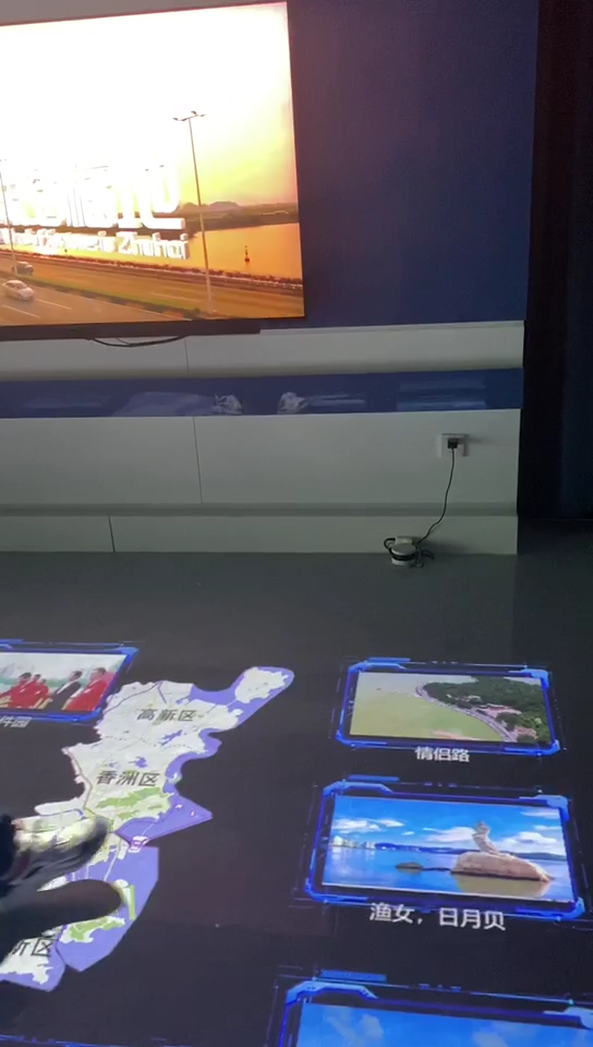 比如,在地面投影出一塊地圖,當(dāng)游客的腳步踏到對(duì)應(yīng)的行政區(qū)塊,屏幕上就會(huì)顯示該區(qū)域的人口、產(chǎn)業(yè)等信息,還可以通過(guò)語(yǔ)音播報(bào)來(lái)提示。