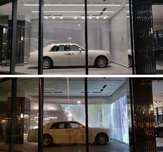 在夜晚閉店后,隱藏的紗幕就會降下,將展廳變?yōu)槿⒄故緳淮啊淮芭溆袀鞲衅,?dāng)有行人在窗前駐足觀賞時(shí),投影畫面會消失,燈光打開,使勞斯萊斯汽車聚焦在燈光下,可謂精彩至極。