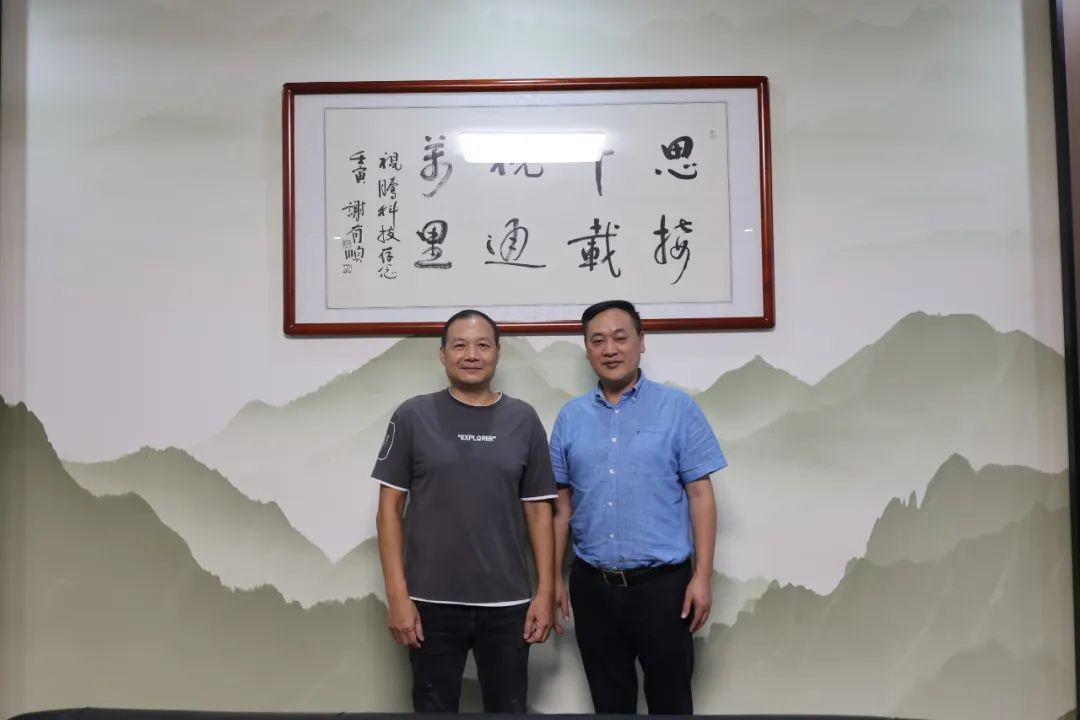 隨后,謝博導(dǎo)一行在黃總的帶領(lǐng)下來(lái)到黃總辦公室,踏入辦公室,映入眼簾的便是謝博導(dǎo)親筆所書(shū),黃總視若珍寶裱掛于墻的書(shū)法作品“思接千載,視通萬(wàn)里”,一筆一筆樸實(shí)無(wú)華而兼納乾坤的鐵畫(huà)銀鉤,是中山大學(xué)與視騰科技緊密相連的紐帶,亦是廣大中山大學(xué)學(xué)子走出校園、奔向社會(huì)實(shí)踐的橋梁。