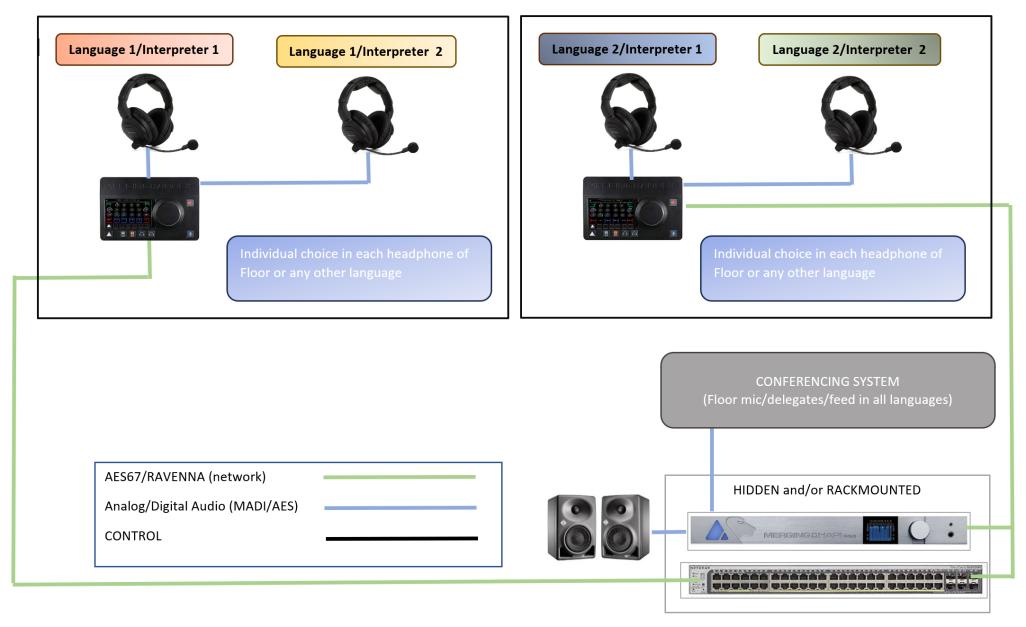 所有Anubis均通過(guò)網(wǎng)絡(luò)互聯(lián)互通(AES67/ST2110),因此每個(gè)音頻流在任一Anubis上均可用。Hapi Mk II(AD/DA、Madi、AES/EBU轉(zhuǎn)換器)擁有所有標(biāo)準(zhǔn)格式,作為輸入/輸出點(diǎn)連接到現(xiàn)有的控制臺(tái)、PA或會(huì)議系統(tǒng)。這種口譯解決方案的一個(gè)主要優(yōu)點(diǎn)是,它能通過(guò)VPN和每個(gè)Anubis的IP地址進(jìn)行遠(yuǎn)程控制。