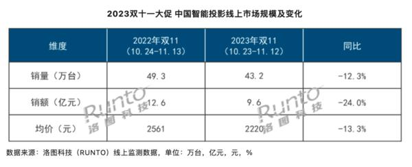 在此前剛剛結束不久的雙十一電商大促中,激光投影在市場之中迎來了逆勢走高態(tài)勢。根據(jù)洛圖科技(RUNTO)線上監(jiān)測數(shù)據(jù)顯示,2023年雙十一大促期間(10月23日-11月12日),中國智能投影在線上公開零售渠道的銷量為43.2萬臺,同比下降12.3%;銷額為9.6億元,同比下降24.0%。