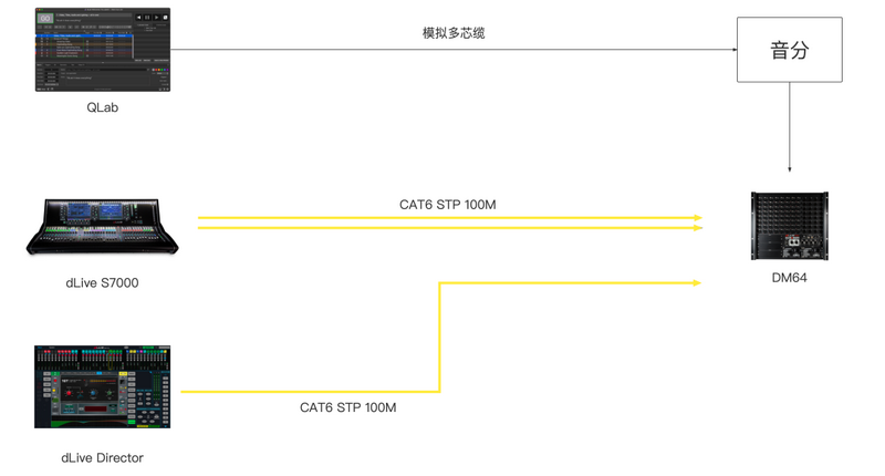 本次活動(dòng)FOH調(diào)音臺(tái)使用了一張dLive S7000臺(tái)面搭配一臺(tái)DM64混音機(jī)架,S7000和DM64使用兩根網(wǎng)線進(jìn)行冗余連接。為確保安全性,另外從DM64混音機(jī)架位置至FOH調(diào)音臺(tái)位置單獨(dú)接了一根網(wǎng)線,將這第三條網(wǎng)線直接與Macbook連接,使用dLive Director作為備份調(diào)音臺(tái)。