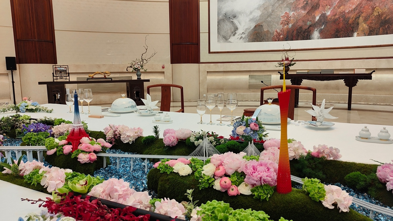 走進宴會廳,會發(fā)現(xiàn)氣韻生動、動靜相映的中式藝術(shù)在這里了體現(xiàn)得淋漓盡致,尤其是餐桌上匯集了中法兩國、廣州、巴黎兩座城市的標志性特征。如兩條河、兩座橋、兩尊塔、兩只白瓷青花話筒···