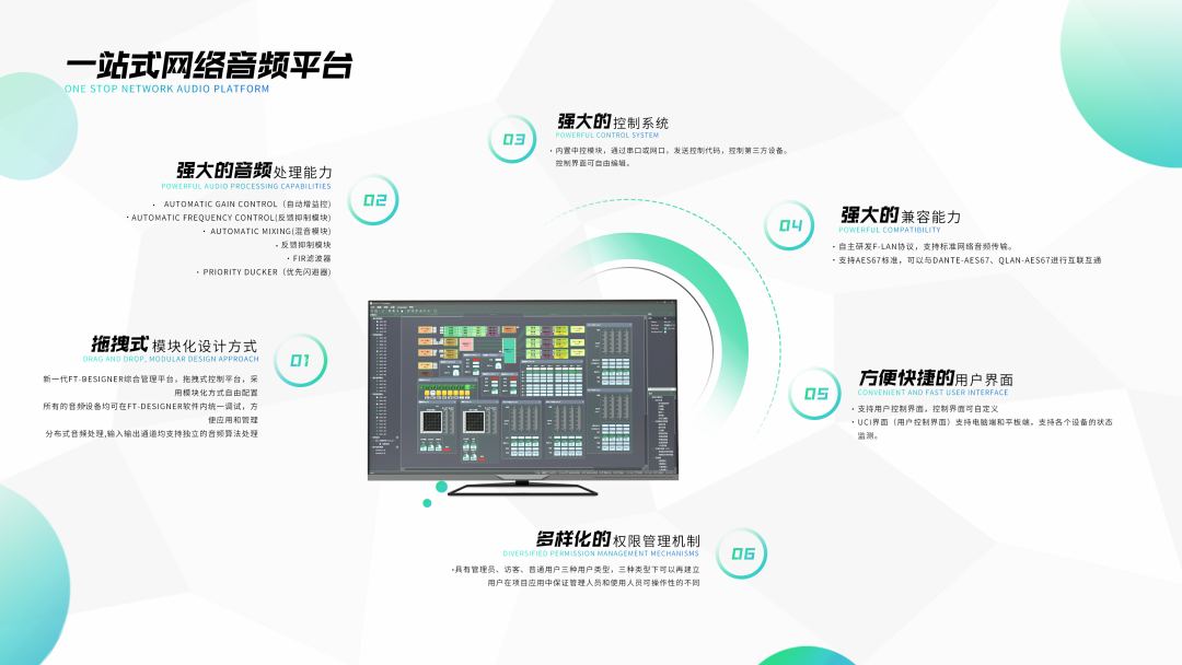 FionTu方圖網(wǎng)絡(luò)音頻生態(tài)系統(tǒng)由數(shù)字音頻中央處理系統(tǒng)、網(wǎng)絡(luò)中心機(jī)數(shù)字網(wǎng)絡(luò)音頻矩陣處理器、FT-Designer數(shù)字化網(wǎng)絡(luò)音頻處理平臺、網(wǎng)絡(luò)音頻DSP接口機(jī)、網(wǎng)絡(luò)可調(diào)指向性DSP陣列音柱、雙備份POE網(wǎng)絡(luò)DSP陣列音柱、雙備份POE網(wǎng)絡(luò)DSP吸頂音箱、聲光視訊電中樞工作站、觸控面板、模擬網(wǎng)絡(luò)雙備份DSP功放、等系列產(chǎn)品組成。