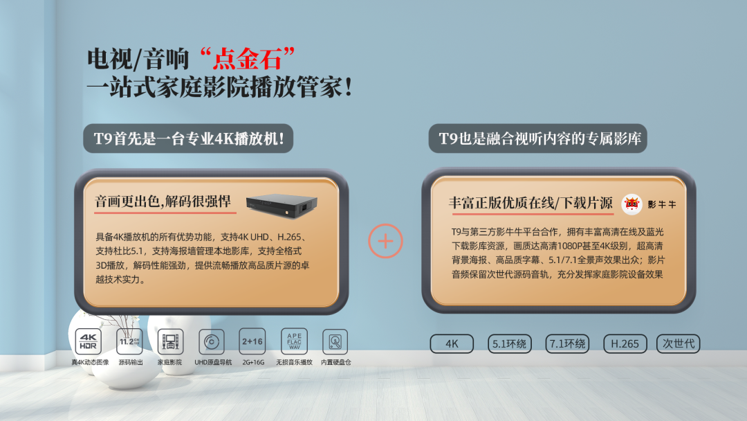 而且,T9真正意義上一步到位搞定播放源和內(nèi)容源,行成完善的硬件+內(nèi)容生態(tài),提供高品質(zhì)影音一站式服務(wù),讓萬(wàn)千家庭視聽(tīng)品質(zhì)邁上了新臺(tái)階!
