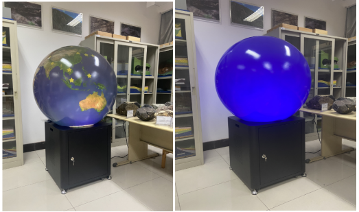 此球型顯示加觸摸互動(dòng)功能系統(tǒng)可以全方位展示各種天體、地貌、地質(zhì)構(gòu)造、經(jīng)緯度、洋流等等地理知識(shí)點(diǎn)的完整形態(tài)。真實(shí)立體的展現(xiàn)地理教學(xué)的課件。