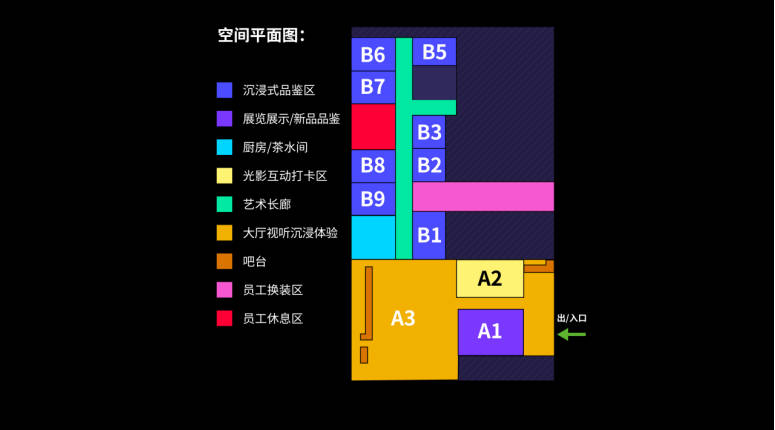 A區(qū):大廳戲劇酒吧區(qū)劃分為靜態(tài)展示區(qū)、光影餐廳、網(wǎng)紅打卡區(qū)三大空間,展現(xiàn)不同的沉浸式場景。