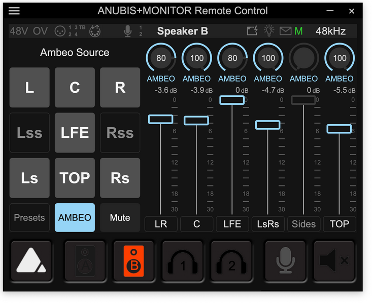 AMBEO 雙聲道空間音頻實(shí)時(shí)渲染器讓所有觀眾都能領(lǐng)略環(huán)繞聲和沉浸式內(nèi)容的魅力。圖中所示為渲染器界面的原型機(jī),可對更有空間感的雙聲道混音進(jìn)行微調(diào),可通過標(biāo)準(zhǔn)Anubis遠(yuǎn)程控制軟件進(jìn)行控制