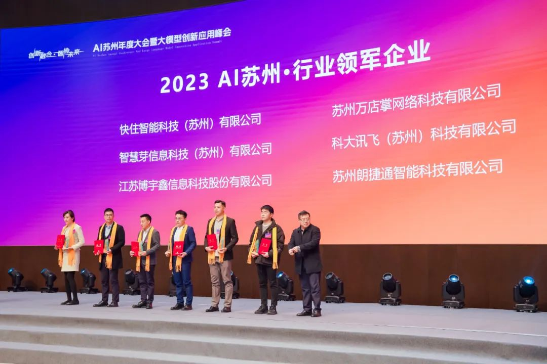為進(jìn)一步貫徹國(guó)家人工智能發(fā)展重要戰(zhàn)略,現(xiàn)場(chǎng)舉行了2023年度人工智能行業(yè)系列評(píng)選頒獎(jiǎng)儀式,表彰在人工智能數(shù)字產(chǎn)業(yè)化關(guān)鍵共性技術(shù)研究和智能產(chǎn)品開(kāi)發(fā)中取得較大成果,或在人工智能大模型賦能垂直細(xì)分行業(yè)的研發(fā)和應(yīng)用達(dá)到領(lǐng)先水平的企業(yè),快住集團(tuán)、科大訊飛、思必馳科技、科沃斯機(jī)器人在內(nèi)的一批優(yōu)秀企業(yè),榮獲AI蘇州·行業(yè)領(lǐng)軍企業(yè)榮譽(yù)稱(chēng)號(hào)。