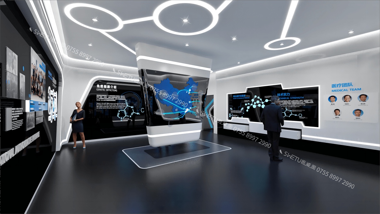 為展示大健康產(chǎn)業(yè)的政策及發(fā)展趨勢,探索生命的奧秘。會(huì)提取個(gè)種細(xì)胞、基因等元素造型,制造鮮明的 視覺記憶,立足展廳現(xiàn)實(shí)環(huán)境,思威圖數(shù)字 強(qiáng)化展廳形象識(shí)別和個(gè)性體驗(yàn)。 打破呆板形制, [敏感詞]化減少空間硬性分隔 。也充分利用空間的高度, [敏感詞]化釋放空間通透性和舒適尺度 ;通過 功能模塊+主題模式 ,有機(jī)融合多媒體展示技術(shù),互動(dòng)體驗(yàn)和信息傳達(dá);以 情景化設(shè)計(jì) 將展示主題與形象識(shí)別統(tǒng)一,營造體驗(yàn)興奮點(diǎn),終打造 科技、簡約、動(dòng)感 的未來 展示空間。