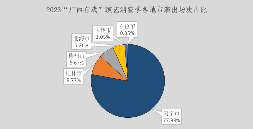 2023年,“廣西有戲”演藝消費(fèi)季全區(qū)演出場(chǎng)次285場(chǎng)。其中,南寧市222場(chǎng),桂林市25場(chǎng),柳州市19場(chǎng),北海市15場(chǎng),玉林市3場(chǎng),百色市1場(chǎng)。演出類型中,劇場(chǎng)演出273場(chǎng),大型演唱會(huì)與音樂節(jié)12場(chǎng)。在演藝消費(fèi)季等利好政策加持下,廣西演出市場(chǎng)復(fù)蘇明顯,演出場(chǎng)次較2022年同比增長243%。2023“廣西有戲”演藝消費(fèi)季演出引進(jìn)補(bǔ)助實(shí)施細(xì)則規(guī)定,補(bǔ)助分為劇場(chǎng)類演出補(bǔ)助和音樂節(jié)(演唱會(huì))類演出補(bǔ)助兩大類,其中對(duì)劇場(chǎng)類演出給予不高于20萬元/場(chǎng)補(bǔ)助,對(duì)音樂節(jié)(演唱會(huì))類演出給予不高于200萬元/場(chǎng)補(bǔ)助。利好政策極大地刺激了優(yōu)質(zhì)演藝項(xiàng)目的落地,演藝消費(fèi)季期間,桂林、柳州、北海等地的營業(yè)性演出場(chǎng)次均破兩位數(shù),南寧市的演出市場(chǎng)受到政策刺激效果最為明顯,各類演出222場(chǎng),占全區(qū)總數(shù)的77.89%。