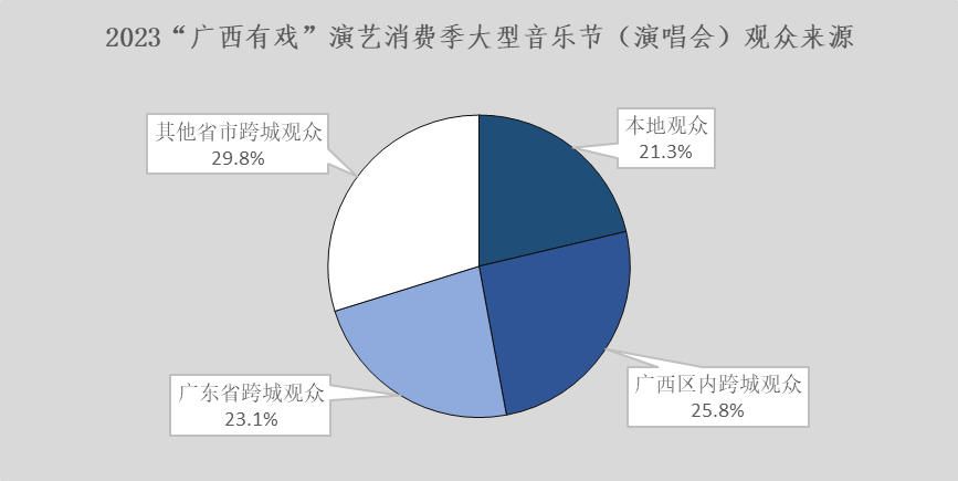 細(xì)分劇場(chǎng)演出與大型音樂節(jié)(演唱會(huì))觀眾來源占比,劇場(chǎng)觀眾來源本地占比92.6%,跨城觀眾占比7.4%,南寧市的劇場(chǎng)跨城觀眾比例最高,跨城觀眾占比11.4%。大型音樂節(jié)(演唱會(huì))觀眾來源本地占比21.3%,跨城觀眾占比78.7%,廣西區(qū)內(nèi)跨城觀眾占比25.8%,廣東省觀眾占比23.1%,其他省市觀眾占比29.8%,廣東省是廣西大型演唱會(huì)與音樂節(jié)觀眾的重要來源地。