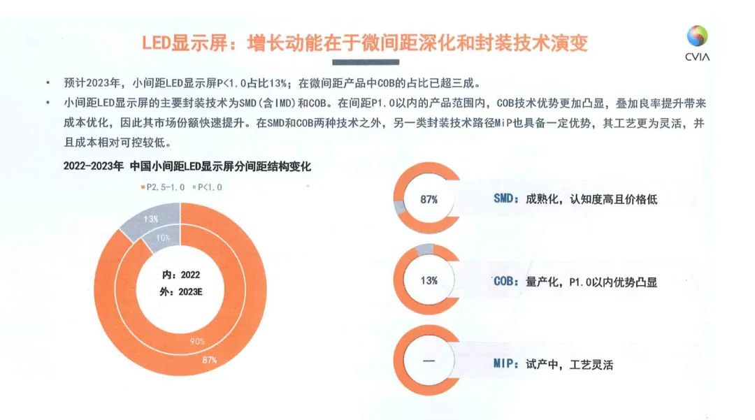 中國電子視像行業(yè)協(xié)會(huì)發(fā)布(CVIA)《2023年中國電子視像行業(yè)發(fā)展報(bào)告》,認(rèn)為“LED顯示屏:增長動(dòng)能在于微間距深化和封裝技術(shù)演變”“預(yù)計(jì)2023年,小間距LED顯示屏P<1.0占比13%;在微間距產(chǎn)品中COB的占比已超三成”,報(bào)告指出:“在間距P1.0以內(nèi)的產(chǎn)品范圍內(nèi),C0B技術(shù)優(yōu)勢更加凸顯,疊加良率提升帶來成本優(yōu)化,因此其市場份額快速提升”。