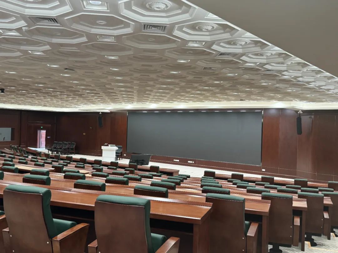 國家行政學院多功能廳長32米,寬24米,層高約3.3米,座位采用階梯式布置,舞臺設置在教室的長邊,舞臺寬約16米,深4米。