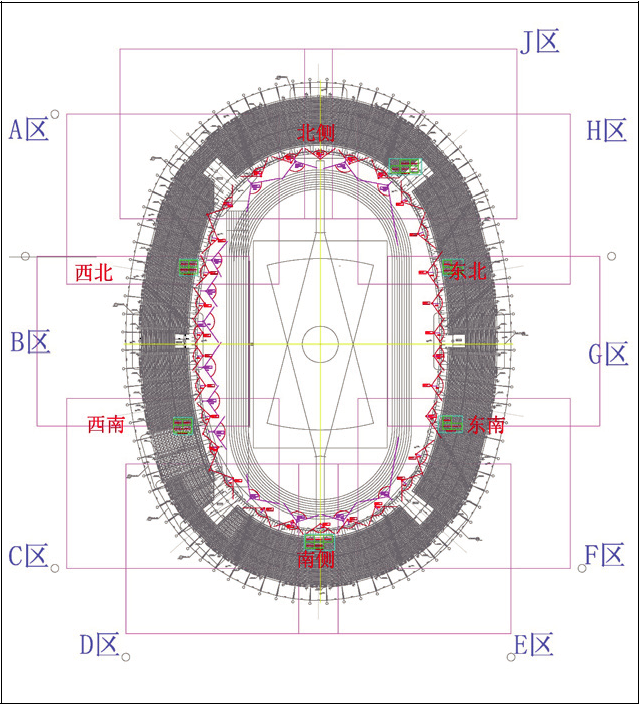 天線接收方案設(shè)計(jì)中,共計(jì)使用了4組指向型天線進(jìn)行信號(hào)接收,分別架設(shè)在大蓮花上層看臺(tái)及一層看臺(tái),上層放置的指向天線用于主舞臺(tái)無(wú)線信號(hào)全覆蓋,一層看臺(tái)架設(shè)的指向天線用于接收火炬臺(tái)附近使用的無(wú)線設(shè)備。
