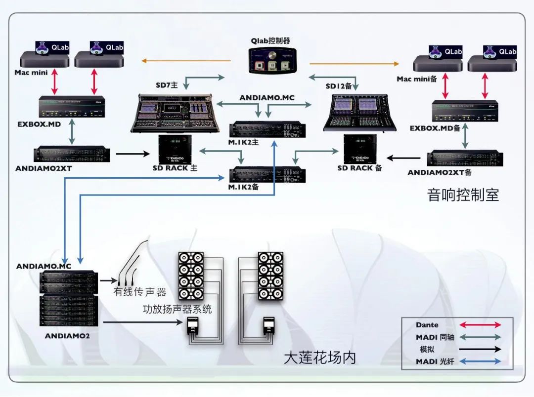 杭州亞運(yùn)會(huì)開(kāi)閉幕式音響系統(tǒng)的方案設(shè)計(jì)中,安全性和穩(wěn)定性是突出考慮的因素,采用了多層次、多方式的備份和冗余機(jī)制,以確保系統(tǒng)在可能發(fā)生的各種問(wèn)題情況下系統(tǒng)能夠正常運(yùn)行。如關(guān)鍵的傳聲器信號(hào)傳輸采用了數(shù)字無(wú)線信號(hào)、模擬有線信號(hào)的備份傳輸模式;音頻同步播放系統(tǒng)的自動(dòng)冗余切換機(jī)制也展現(xiàn)了目前最前沿的音響技術(shù)。另一個(gè)亮點(diǎn)就是基本實(shí)現(xiàn)了揚(yáng)聲器的國(guó)產(chǎn)化,包括觀眾席主擴(kuò)、主席臺(tái)補(bǔ)聲,控臺(tái)區(qū)域補(bǔ)聲以及場(chǎng)地內(nèi)返送均為國(guó)產(chǎn)揚(yáng)聲器。