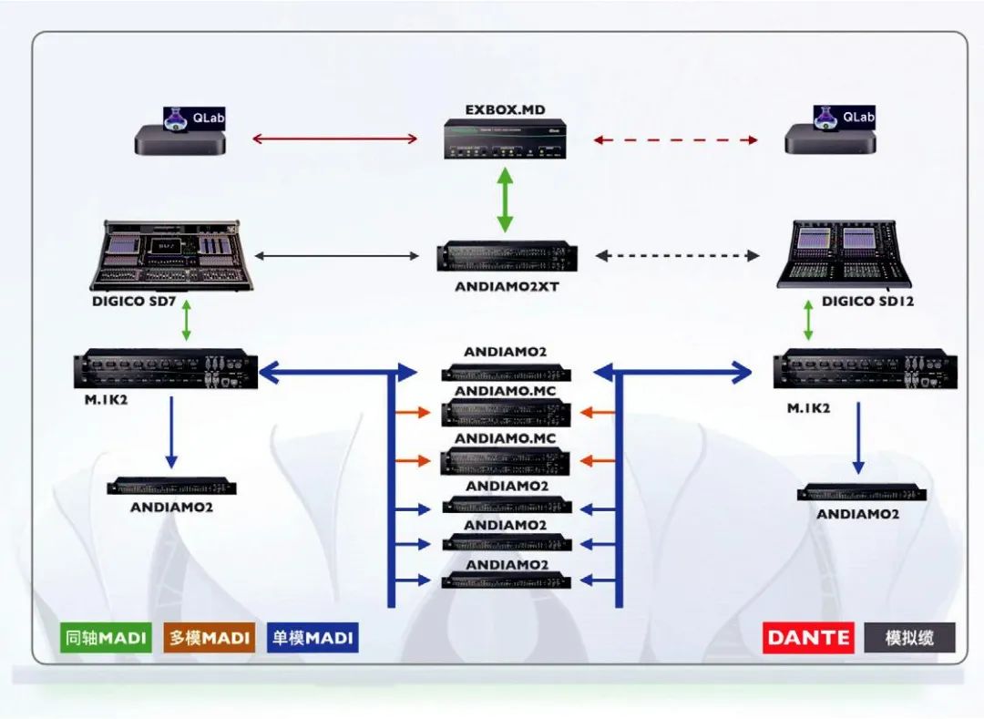 如何保證系統(tǒng)安全、穩(wěn)定地運(yùn)行,系統(tǒng)架構(gòu)的設(shè)計(jì)尤為關(guān)鍵。該音響系統(tǒng)的控制以大型雙引擎擴(kuò)聲調(diào)音臺(tái)為核心,輔以一張同品牌中型擴(kuò)聲調(diào)音臺(tái)作為實(shí)時(shí)備份,并各配一個(gè)也是完全相互備份的接口箱;主調(diào)音臺(tái)的雙引擎架構(gòu)可以做到兩個(gè)引擎無(wú)縫切換,這樣調(diào)音臺(tái)系統(tǒng)實(shí)現(xiàn)了界面雙重備份,物理臺(tái)面及接口箱也雙重備份;信號(hào)傳輸以由擴(kuò)聲調(diào)音臺(tái)及接口箱組成的獨(dú)立環(huán)形架構(gòu)為基礎(chǔ),通過(guò)MADI矩陣星形路由的傳輸機(jī)制傳輸給功率放大器進(jìn)行信號(hào)輸出,從而組成了由環(huán)形加星形交織的系統(tǒng)架構(gòu),如圖11所示。