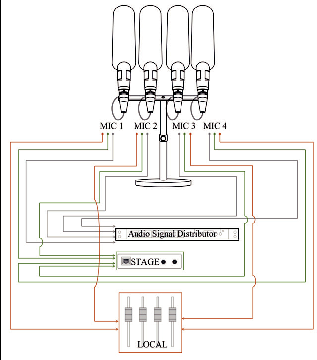 除WLS組與MIC組雙傳輸備份模式外,每組傳輸模式下采用2支或多支傳聲器的方式在信號(hào)傳輸通道數(shù)量上進(jìn)行備份。MIC組下以4支傳聲器進(jìn)行音頻信號(hào)的拾音,WLS組下以2支傳聲器進(jìn)行重要音頻信號(hào)的拾音與傳輸,如圖14所示。