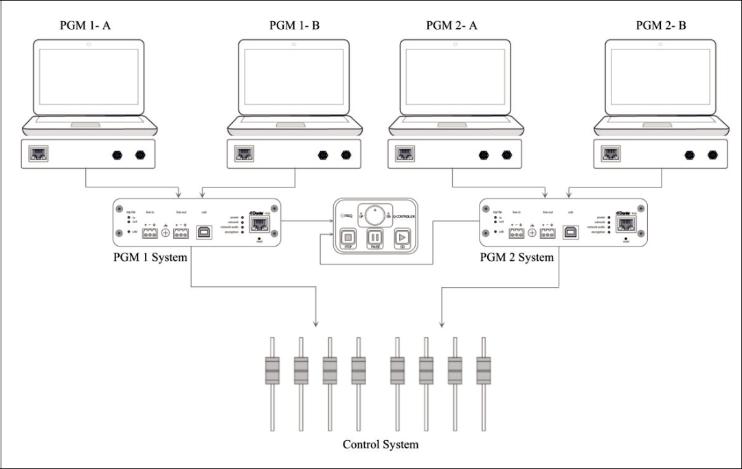 音頻同步播放系統(tǒng)也有同樣的安全性要求,因此系統(tǒng)中使用了4臺(tái)搭載播放程序的主機(jī),并通過(guò)控制器實(shí)現(xiàn)多臺(tái)同步聯(lián)動(dòng)播放,如圖15所示。每2臺(tái)播放器為一組,信號(hào)分別進(jìn)入到同一臺(tái)具有IP轉(zhuǎn)基帶功能以及自動(dòng)冗余切換路由功能的信號(hào)轉(zhuǎn)換選切盒中,之后再通過(guò)數(shù)模轉(zhuǎn)換進(jìn)入接口箱;同時(shí),另一組2臺(tái)播放器通過(guò)相同的方式進(jìn)入一臺(tái)不同地址的備份接口箱中,實(shí)現(xiàn)音頻播放的四重同步切換。其中,值得稱(chēng)道的是信號(hào)轉(zhuǎn)換選切盒所采用的增強(qiáng)型自動(dòng)冗余切換(EARS)技術(shù)將搭載播放程序的主機(jī)連接到信號(hào)轉(zhuǎn)換選切盒,通過(guò)添加導(dǎo)頻信號(hào)到主備電腦的Dante通道上,信號(hào)轉(zhuǎn)換選切盒會(huì)自動(dòng)監(jiān)測(cè)導(dǎo)頻信號(hào),當(dāng)檢測(cè)到播放平臺(tái)導(dǎo)頻信號(hào)丟失后,該設(shè)備可以在1/48 ms內(nèi)做到基本無(wú)縫切換至另一臺(tái)播放主機(jī),從而最大程度保障音頻同步播放系統(tǒng)的安全穩(wěn)定性。