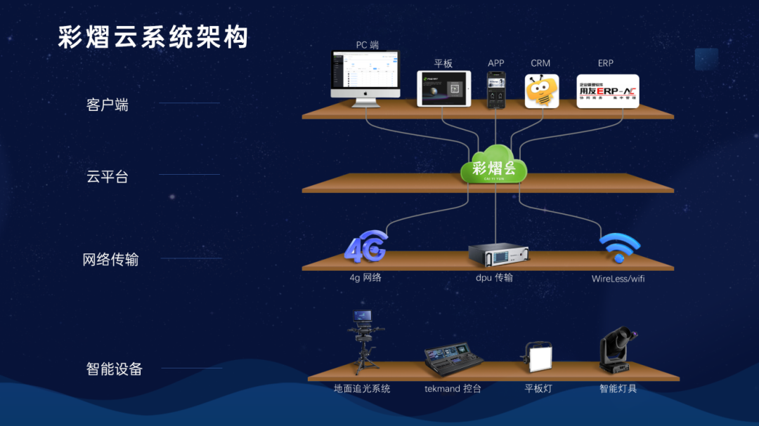 彩熠云系統(tǒng)是基于物聯(lián)網(wǎng)技術(shù),率先在燈光領(lǐng)域推出的燈光云智能信息服務(wù)系統(tǒng),基于“一朵云、兩個(gè)端、多業(yè)務(wù)”的理念,通過在普通舞臺(tái)燈具內(nèi)植入通訊模塊,讓燈具接入云端,隨時(shí)隨地掌握燈具信息。