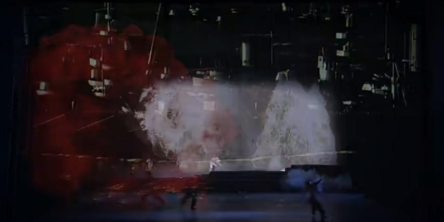 二、虛擬和現實空間更自由地發(fā)生位移。影像的介入成為了連接現實物理空間與虛擬想象空間的媒介,利用影像創(chuàng)造出未來或者是世上已不存在的虛擬空間通過數字影像方式呈現在舞臺之上,制造更加逼真的戲劇視幻效果。
