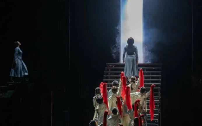 例如23年國家大劇院上演的歌劇《青春之歌》,以“青春”與“革命”為主線,人生岔路中面臨多次的抉擇,林道靜走向階梯盡頭,45度傾斜的鏡面屏幕,展現了女主三種不同視角的形象:渴望自由、積極革命以及對國家美好未來的期許。象征著生命價值的重選,體現了她的心胸、格局、境界,更體現了不同的意義理解、價值的選擇、責任的擔當。與“熱血青年對理想追求”的主題所期望的情感表達完美契合,演員與影像的配合為整體戲劇創(chuàng)作提供情感上的情境合一,以影像裝置與舞美設計結合方式完成對戲劇藝術的磨礪與錘煉,使思辨意義更加深入人心。