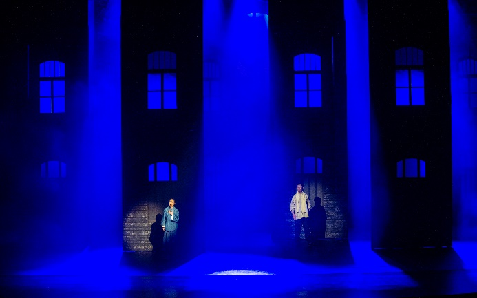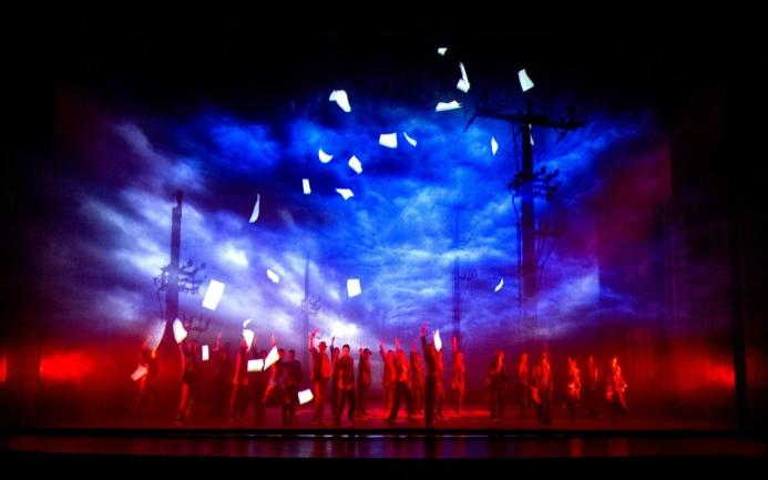 例如22年煙臺市歌舞劇院演出音樂劇《審判日》,楊祿奎死后與妻子告別后區(qū)景片不停的交叉位移,配合多媒體大屏上的影像的畫面,街景穿梭流動在他與妻子之間,兩人相互伸手試圖找尋對方。以裝置影像變化的形式塑造一場陰陽兩隔的情感交匯,是一場他與妻子跨越時空、跨越生死的對話。以影像和動作語線的雙向移動,具象闡釋生死離別的悲劇畫面,將二人極度悲傷的情感延伸外化。