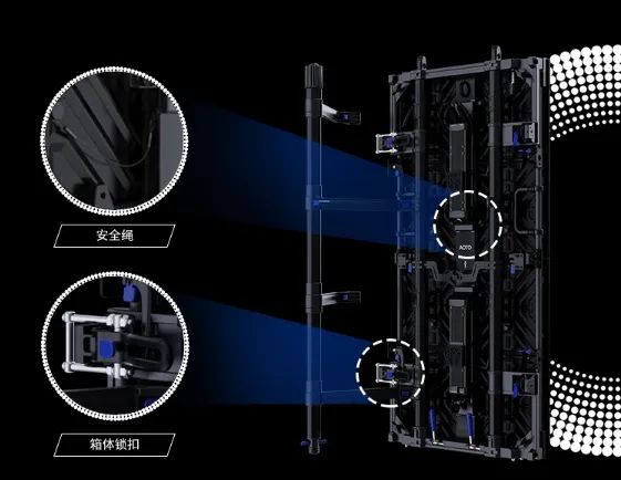 產(chǎn)品配置風(fēng)阻架,可有效抵御八級大風(fēng),加上高戶外防護(hù)等級,使其能夠輕松適應(yīng)各種復(fù)雜的環(huán)境。箱體鎖扣在產(chǎn)品設(shè)計上實(shí)現(xiàn)更粗壯,可牢牢鎖定箱體之間的連接點(diǎn)。模組配備安全繩索設(shè)計,使其不會輕易地掉落,為現(xiàn)場的舞臺演出、大型活動保駕護(hù)航。