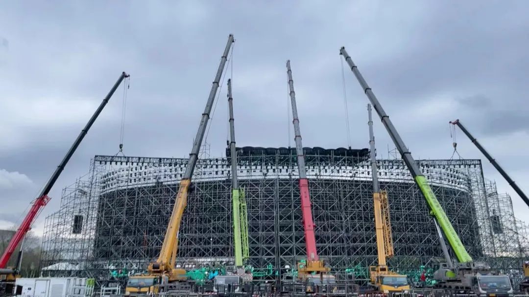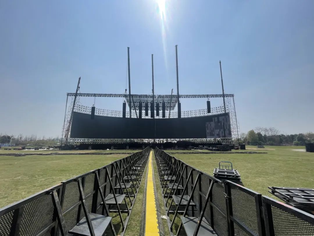 七臺大型吊車吊掛起5倍于傳統(tǒng)音樂節(jié)的音箱數(shù)量和舞臺頂棚