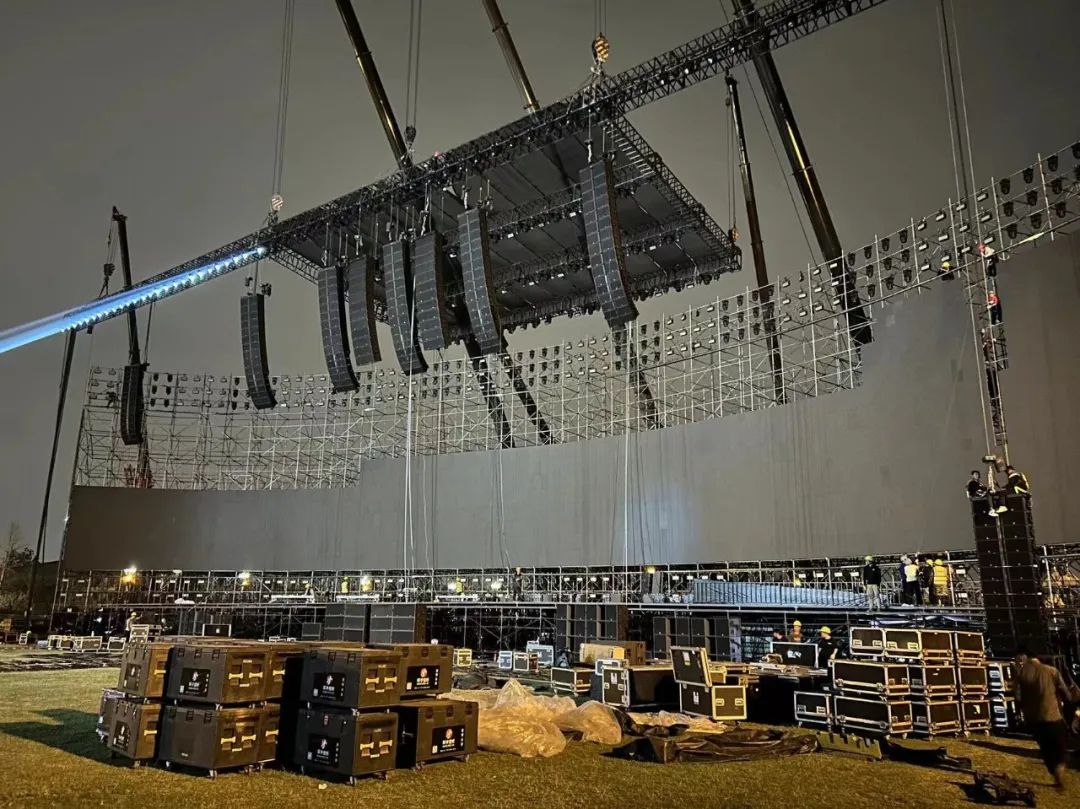 這次音箱數(shù)量是傳統(tǒng)的五倍,加上舞臺為全新無柱化零遮擋結(jié)構(gòu)且跨度極大,制作團隊經(jīng)過多番論證和協(xié)商,在得到成都各級政府部門及主辦方的支持下,開創(chuàng)性地使用了七臺200噸承重的吊車用于舞臺前面九組陣列以及舞臺頂棚的吊掛,完全沒有接地立柱,并且僅用了一天時間完成了系統(tǒng)的安裝,為日后音樂節(jié)、演唱會大型音響系統(tǒng)的搭建提供了新的思路。