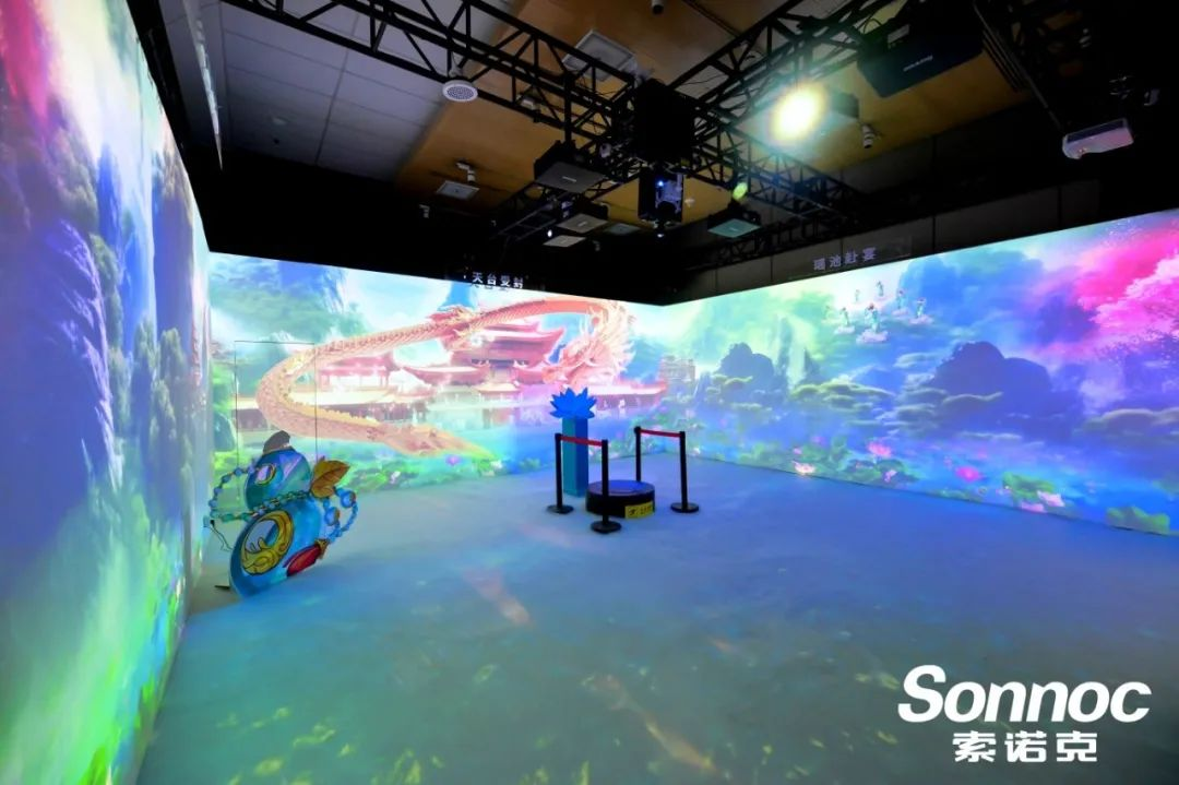 深入步入展項(xiàng),在天宮受封沉浸式投影展區(qū)中,2臺(tái)索諾克Sonnoc新品SNP-LU13KC激光投影機(jī)與6臺(tái)SNP-LC85DU激光投影機(jī)打造充滿神秘色彩的沉浸式“天宮”世界。
