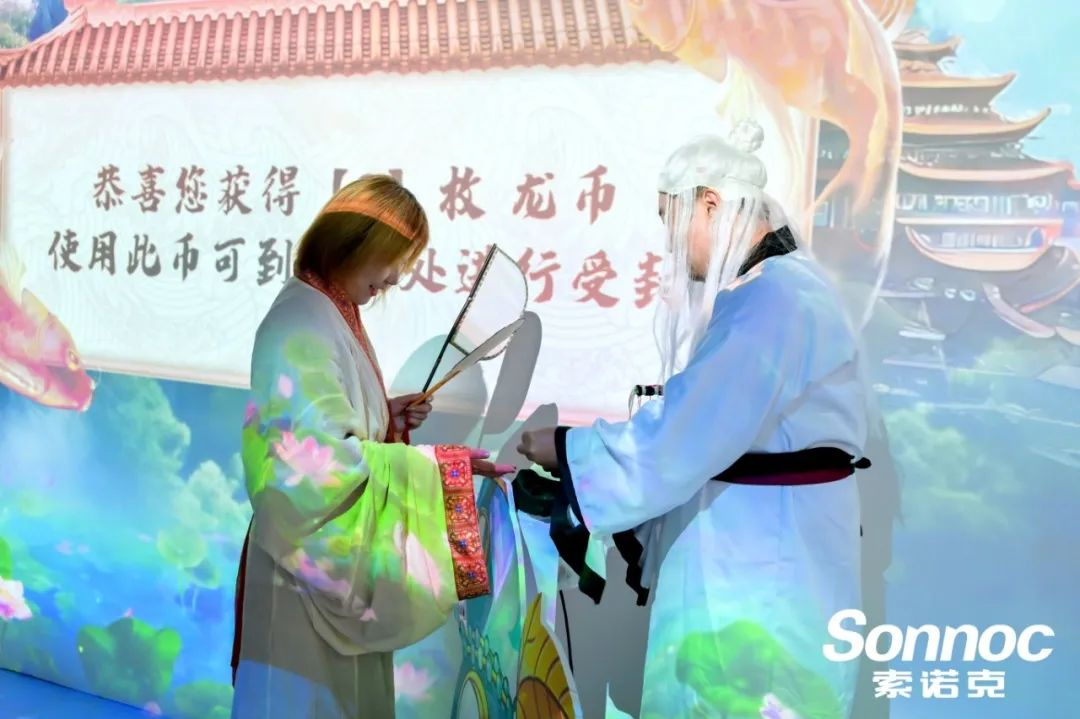 現(xiàn)場(chǎng)有“蟠桃仙女“進(jìn)行指引,觀眾在上輪體驗(yàn)獲取的金幣可參與到此輪的投幣游戲中,不同金幣可獲得不同的龍王身份,分別有東南西北四位龍王,讓觀眾也體驗(yàn)一把當(dāng)神仙的樂趣。