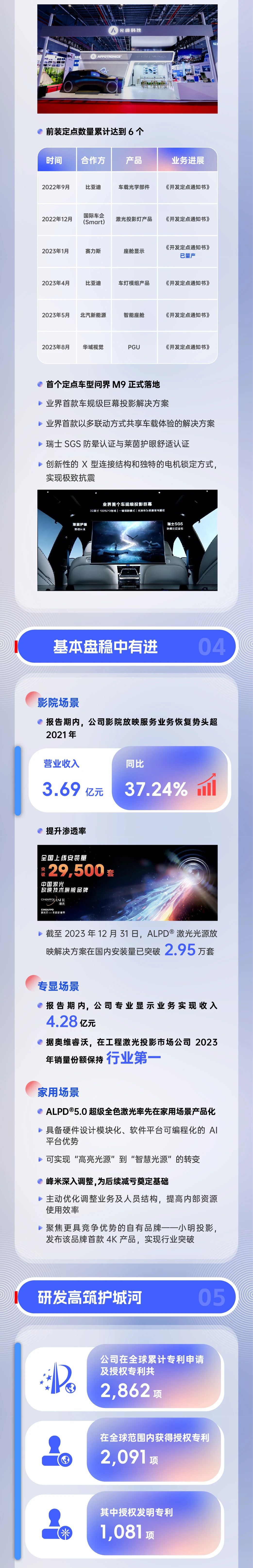 2013年率先推出全球首款100英寸激光電視,在電視領(lǐng)域?qū)崿F(xiàn)“中國創(chuàng)造、國際制造”。隨后攻克顯示領(lǐng)域里更具挑戰(zhàn)的電影放映技術(shù),該技術(shù)榮獲2014年國家重點(diǎn)產(chǎn)品認(rèn)定及2017年中國電影電視技術(shù)學(xué)會(huì)科學(xué)技術(shù)一等獎(jiǎng)。光峰與中影集團(tuán)合作推出基于ALPD®技術(shù)的中國激光巨幕,影院安裝量超過14000套,在激光電影放映市場(chǎng)占有率超過60%。