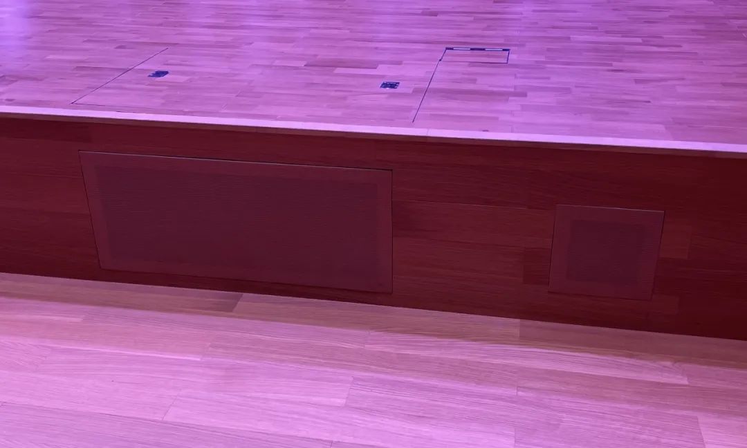 音樂(lè)廳的臺(tái)唇嵌入了一款緊湊參考級(jí)超低揚(yáng)聲器-KS21i,它使用了一個(gè)高振幅偏移、直接投射的21”換能器并安裝在低頻反射調(diào)諧的箱體中,且配備L-Vents層流通風(fēng)口,這使得在高輸出使用時(shí)能夠減少湍流和出口噪聲,同時(shí)也提高低頻效率。與同尺寸的超低音揚(yáng)聲器相比,先進(jìn)配件和層流通風(fēng)口的結(jié)合提高了KS21i的瞬態(tài)聲壓級(jí),在與A10i共用時(shí),加強(qiáng)了其低頻響應(yīng),并將頻響帶寬下限擴(kuò)展31Hz。