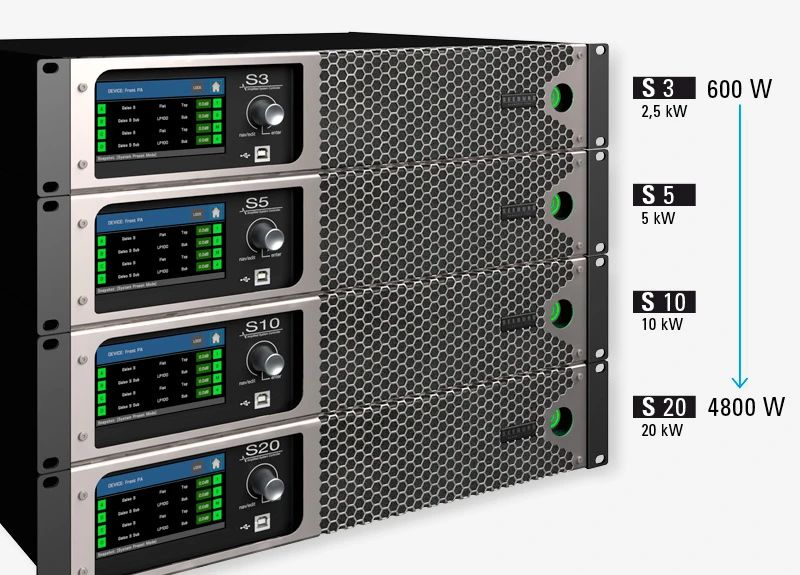 最后不得不提的就是這套定制“核潛艇”電音系統(tǒng)的驅(qū)動(dòng)功放,同樣是由同廠推薦的四通道系統(tǒng)DSP功放S10/S20:4×4800W/4Ω(高達(dá)近兩萬(wàn)瓦)的高功率低失真輸出,S系列的4通道放大系統(tǒng)控制器將最先進(jìn)的電力電子設(shè)備與先進(jìn)的DSP相結(jié)合,可以通過(guò)觸摸顯示屏方便地進(jìn)行操作。其智能功率共享功能確保在驅(qū)動(dòng)不對(duì)稱(chēng)負(fù)載時(shí)非常有效地使用可用功率。根據(jù)AES 67標(biāo)準(zhǔn),可通過(guò)GPIO和以太網(wǎng)音頻(AoE)進(jìn)行擴(kuò)展。