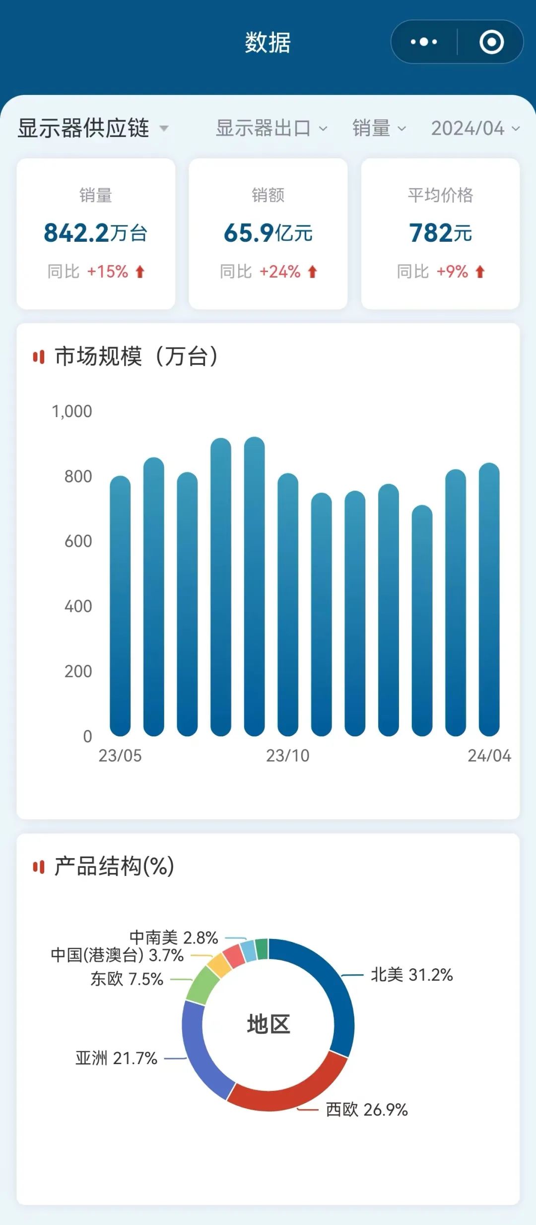 根據(jù)洛圖科技(RUNTO)發(fā)布的《中國大陸顯示器出口市場月度快報(China Monitor Export Market Monthly Express)》數(shù)據(jù)顯示,2024年4月,中國大陸通用顯示器的出口量為842萬臺,同比增長15%;出口額為65.9億元,同比增長24%,按美元計,出口額為9.3億美元,同比增長20%。