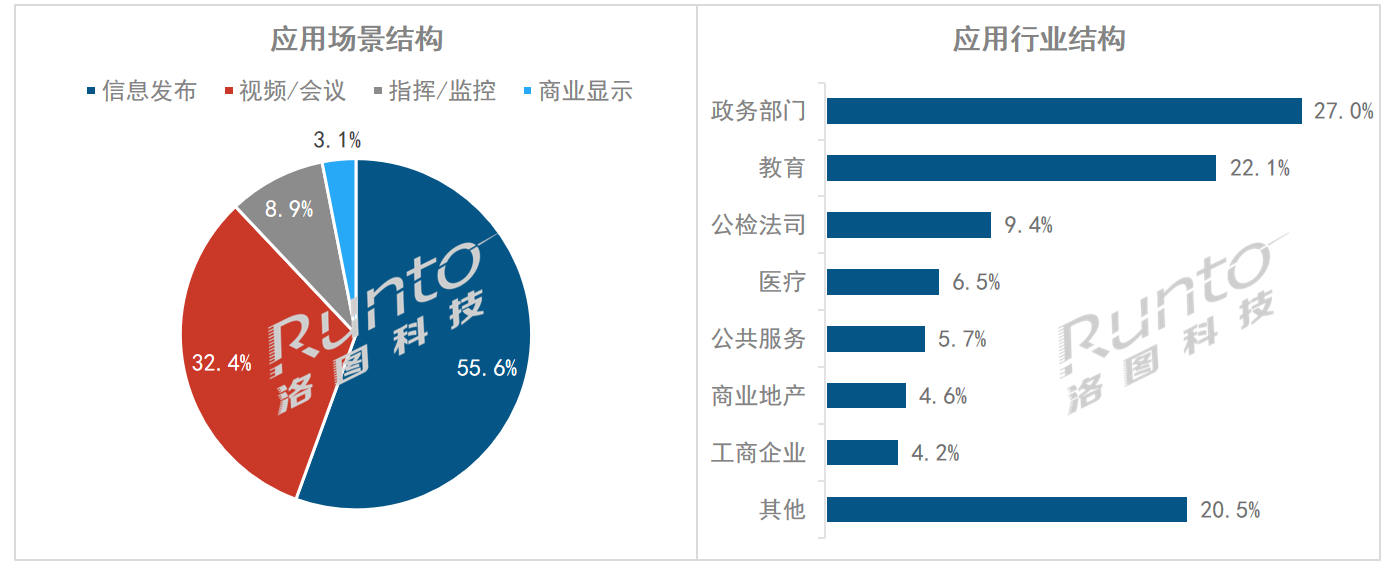 LED顯示受益于微間距化加速和MLED技術(shù)的發(fā)展,對傳統(tǒng)顯示技術(shù)如液晶拼接、DLP拼接、會議投影等產(chǎn)品的替代,已廣泛發(fā)生于政府應(yīng)急、智慧城市、公檢法司、能源、交通、廣電等各行各業(yè)。