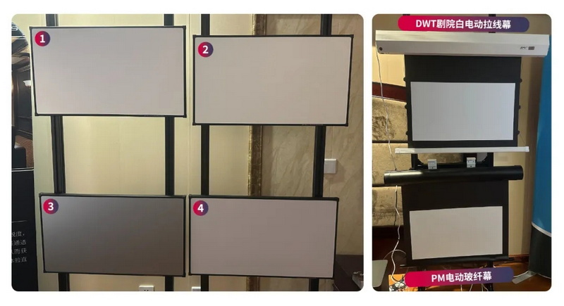 (小樣幕布分別是:①Pearl White 1.3增益珍珠幕、②Pearl White AT 1.3增益珍珠打孔透聲幕、③CineGrey 4D幕、④A8K編織透聲幕)