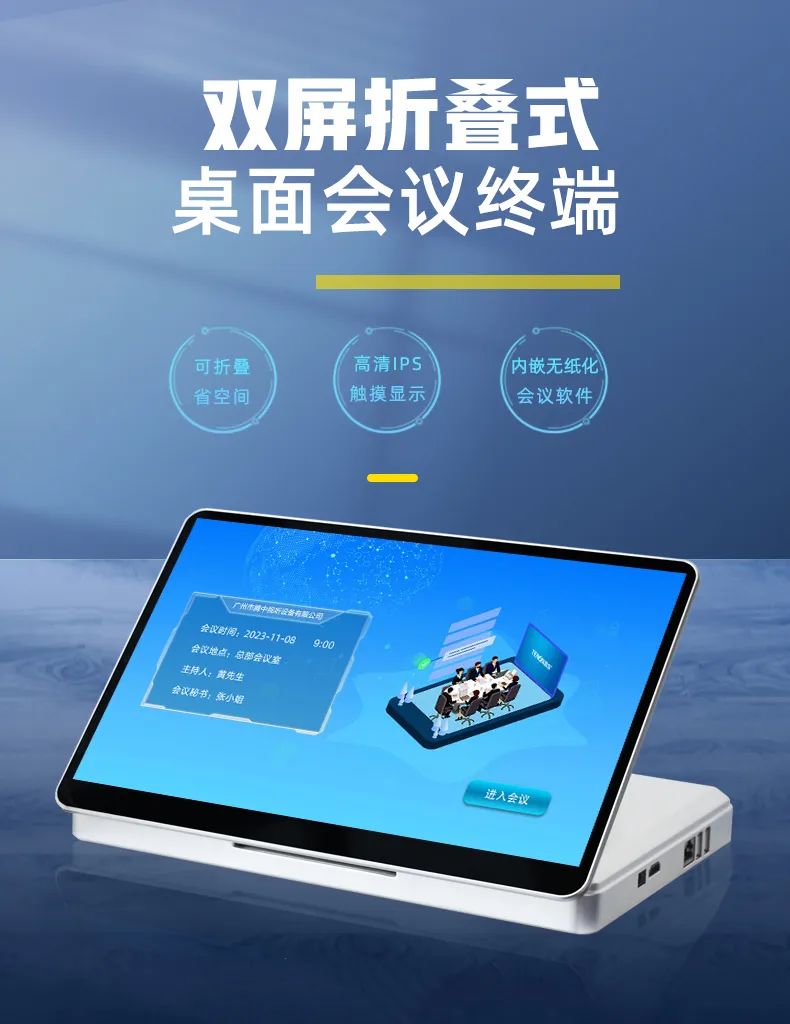 為解決某些會(huì)議室中不允許使用無(wú)線網(wǎng)絡(luò)情況以及舊會(huì)議室改造,騰中研發(fā)了兩款雙面屏桌面式無(wú)紙化會(huì)議終端產(chǎn)品,彌補(bǔ)了無(wú)線型會(huì)議平板只能用無(wú)線聯(lián)網(wǎng)(WIFI)以及舊會(huì)議桌無(wú)法開(kāi)孔放入升降器的不足。該系列產(chǎn)品以其出色的交互性、豐富的會(huì)議功能、絕佳的用戶體驗(yàn),成為會(huì)議室無(wú)紙化會(huì)議產(chǎn)品的新趨勢(shì)。兩款終端搭載13.3/15.6寸多點(diǎn)電容觸摸屏,一體化雙面液晶顯示,其中一款的屏幕可以折疊收納,以其完美的工業(yè)設(shè)計(jì),彰顯產(chǎn)品高端、尊貴。