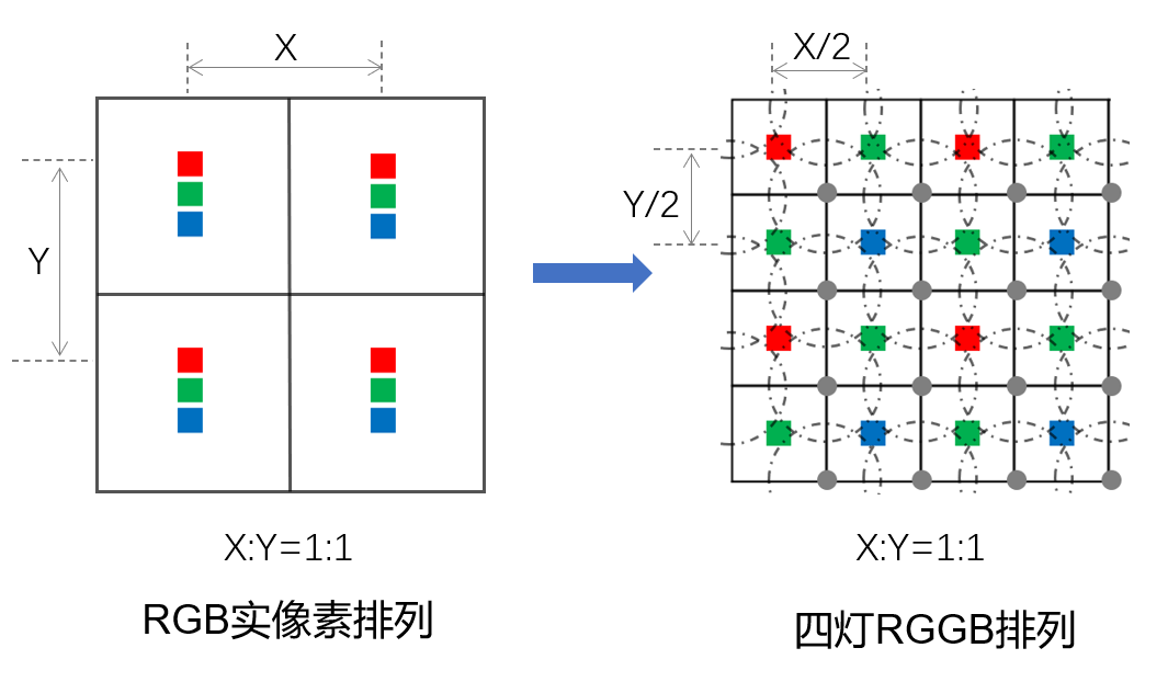 △ 4燈RGGB排布可實現(xiàn)4倍的顯示分辨率提升 △
