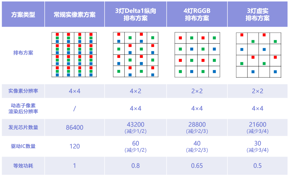 以常見的P0.9 COB燈板為例,對比以下四種方案的發(fā)光芯片及驅(qū)動IC數(shù)量情況: