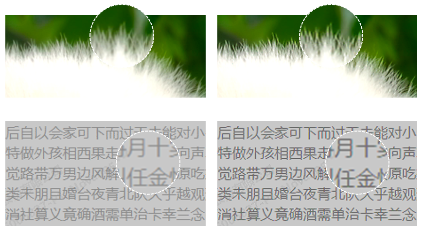 如上右圖,以四燈RGGB排列為例,每個黑色框內(nèi)只有一個子像素,通過先進的動態(tài)子像素渲染技術(shù),可根據(jù)圖像內(nèi)容靈活借調(diào)周邊子像素,使得1個子像素可以實現(xiàn)完整的像素內(nèi)容顯示。對比實像素,在四燈RGGB排列時,每個(RGB)像素只增加一個子像素(G)的情況下,可以實現(xiàn)4倍增的顯示效果。